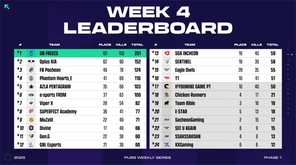 다양한 팀들의 도전 속에서 DN프릭스는 운영부터 슈팅 능력까지 전부 다 최상위 성적을 올렸다. 그 결과 매치4와 매치5 연달아 다시 치킨을 확보, 4주 1일차의 1위를 손쉽게 확정했다. 2위권 경쟁에서 살아남은 것은 팬텀하츠와 FN포천으로, 각각 1일차 2위에 3위를 차지해 눈길을 모았다.