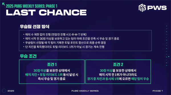 크래프톤이 주관하는 'PUBG: 배틀그라운드(이하 배틀그라운드)'의 한국 공식 e스포츠, '2025 펍지 위클리 시리즈(PWS): 페이즈1'이 앞서 예정된 1주차부터 4주차까지의 정규 경기를 모두 마쳤다. 지난 3월 25일부터 29일까지는 4주차 경기가 진행됐다.
