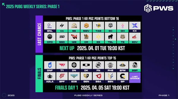 'PWS: 페이즈1' 파이널 경기는 오는 4월 5일과 6일, 서울 송파구 잠실에서 오프라인 경기로 진행된다. 총 16개 팀이 격돌할 예정으로, 피할 수 없는 맞대결로 최후의 한 팀만을 가린다. 또한, 경기 결과를 바탕으로 올해 첫 번째 배틀그라운드 국제전인 '펍지 글로벌 시리즈(PGS)'에 오를 팀 역시 선발한다.