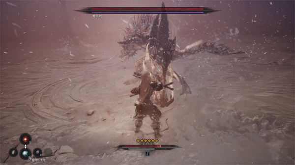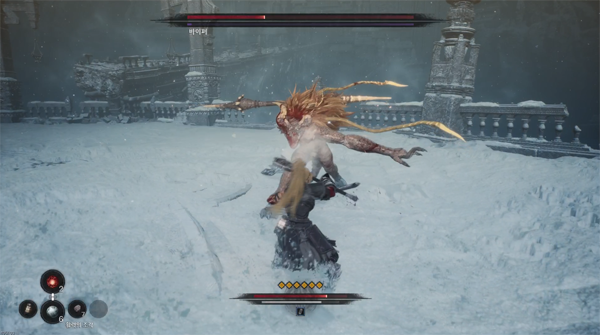첫 단계의 패턴은 간단하다. 큰 모션의 좌우 공격으로 거리를 벌리거나, 이미 엘리트 용족 몬스터로부터 경험한 두 번 찌르기 후 횡공격으로 유저를 괴롭힌다. 몇 번의 사망을 경험해 본다면 쉽게 막아 내는 것이 가능하며, 수월한 공격 기회를 만들 수 있다.