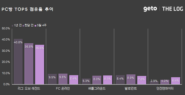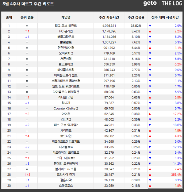 게토에서 제공하는 PC방 게임 통계서비스 더로그에서 2025년 3월 4주(2025. 03. 24 ~ 2025. 03. 30) PC방 주간 리포트를 공개했다.