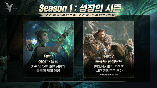 시즌1: 성장의 시즌은 두 개의 파트로 구성된다. 첫 파트는 성장과 득템을 주제로 차원이 다른 빠른 성장과 득템의 재미를 제공한다. 두 번째 파트는 투표와 전쟁모드가 핵심으로서, 인터서버 메인 콘텐츠와 시즌 전쟁모드를 제공한다.