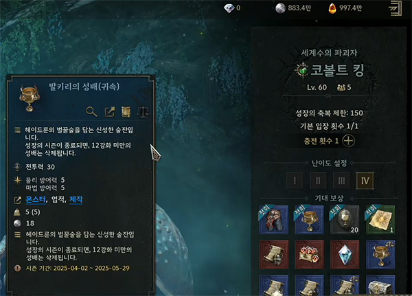 발키리의 성배는 이번 시즌이 지나면 얻을 수 없는 시즌만의 고유 아이템이다. 시즌이 끝나기 전까지 12강을 맞추면 시즌 종료 후에도 아이템을 그대로 가지고 있어 해당 효과를 누릴 수 있다. 하지만, 12강 이하는 시즌 종료 후 소멸한다. 12강이라 높은 강화 수치를 요구하지만, 발키리의 성배를 넉넉히 제공할 방침이다.