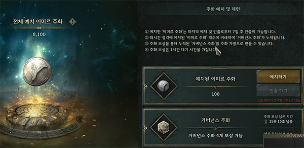 새롭게 추가한 주화 예치 시스템을 통해 이번 시즌의 파트 2에서 사용하게 될 거버너스 주화를 획득할 수 있다. 이미르 주화를 예치하여 시간당 일정량의 거버넌스 주화를 받게 되는데, 이미르 주화 100개에 1시간당 회수하는 거버넌스 주화는 1개다. 주화는 한 번 예치하면 7일 동안 뺄 수 없기 때문에 미리 사용량을 제외하고 예치하는 것이 좋다.