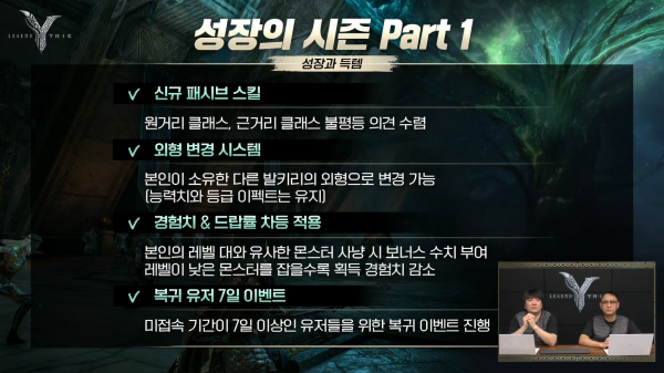 이번 방송에서는 첫 번째 시즌인 성장의 시즌 예고와 함께 게임 시연을 통한 시즌 콘텐츠 체험을 선보였다. 석훈 PD와 김성희 디렉터가 진행을 맡았으며, 동시 시청자 약 2천 명 이상을 기록했다.