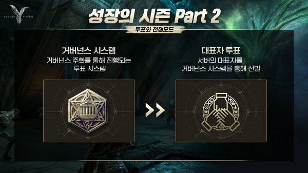 거버넌스 시스템은 거버넌스 주화를 사용해 진행하는 투표 시스템이다. 투표를 통해 서버의 대표자를 직접 선발하며, 거버넌스 주화는 주화를 예치해서 획득할 수 있다.