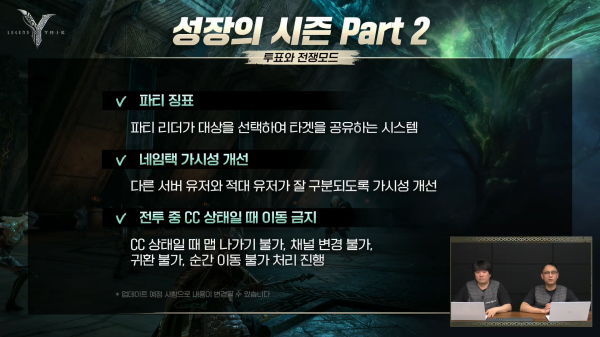 함께 업데이트되는 콘텐츠로는 ▲파티 징표를 통해 파티 리더가 대상을 선택해 타겟을 공유할 수 있다. ▲네임택 가시성 개선으로 다른 서버 유저와 적대 유저가 쉽게 구분되며 ▲전투 중 CC 상태일 때는 맵을 나가거나 채널 변경 등의 행동이 불가능하다.