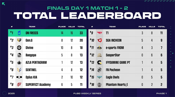 PWS 파이널 매치1과 매치2 경기를 진행한 결과, DN프릭스가 총점 33점으로 1위를 차지했고, 그 뒤를 젠지와 디바인, 배고파 등이 따라붙었다. 이날 경기는 매치6까지 진행되며, 6일 나머지 여섯 매치로 최종 순위를 가린다.