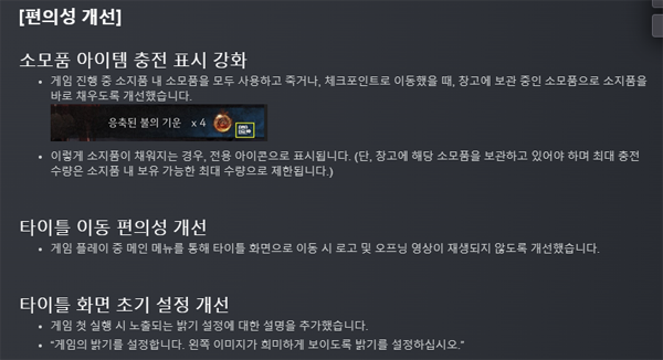 이밖에 게임 진행 중 소지품 내 소모품을 모두 사용하고 죽거나, 체크포인트로 이동했을 때, 창고에 보관 중인 소모품으로 소지품을 바로 채우도록 수정됐다.