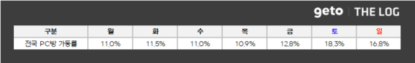 4월 1주 전국 PC방 총 사용시간은 약 1천 360만 시간으로 전주 대비 2.9% 감소, 전월 대비 14.2% 감소, 전년 대비 4.8% 감소한 수치이다. PC방 주간 가동률은 평일 평균 11.4%, 주말 평균 17.6%로 주간 평균 13.2%를 기록했다.