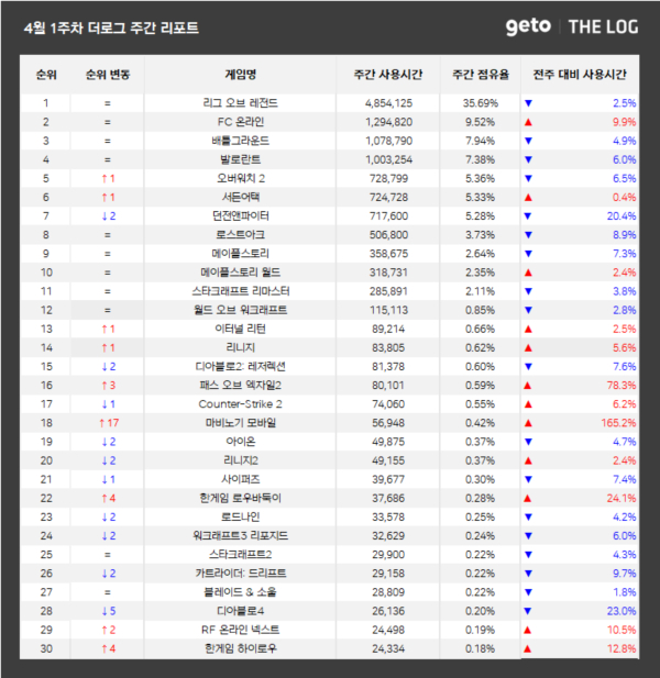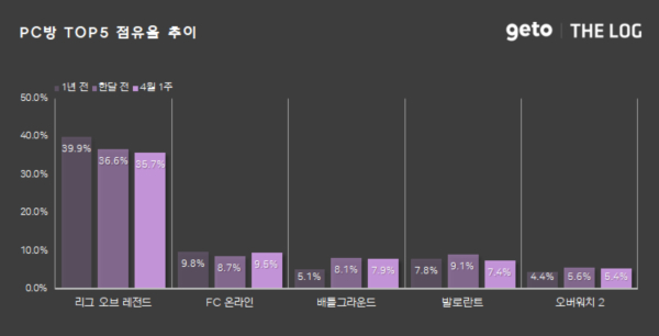 게토에서 제공하는 PC방 게임 통계서비스 더로그에서 2025년 4월 1주(2025.03.31 ~ 2025.04.06) PC방 주간 리포트를 공개했다.