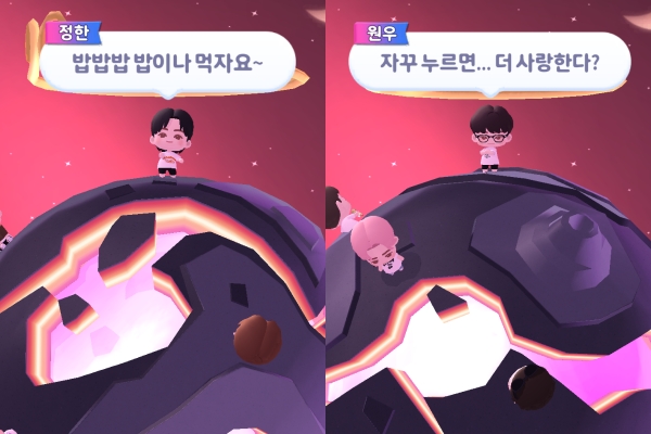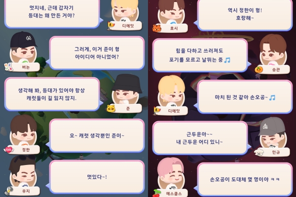 이 과정에서 멤버들이 티키타카를 보여주는 모습이나 농담을 주고받는 모습이 보이는데, 실제로 멤버끼리 대화하는 듯한 흐름을 보여준다. 또한 섬 하나를 클리어할 때마다 노래에 맞춰 단체 댄스를 추는 모습을 볼 수 있고, 그 섬에서 멤버들을 터치해 각각의 멘트도 확인할 수 있다.