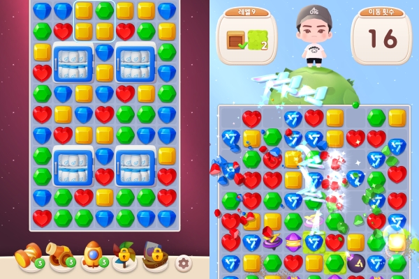 이 과정을 거치면서 유저는 블록을 움직여 3개 이상의 같은 블록을 맞추는 3매치 퍼즐 게임의 플레이 방법을 익히게 된다. 자연스러운 튜토리얼을 진행하는 셈이다. 스테이지 클리어 방법부터 시작해 스테이지마다 주어지는 미션을 해결해 나가게 된다. 블록의 모양은 전체적으로 보석의 느낌을 하고 있어 확실하게 구분이 된다.