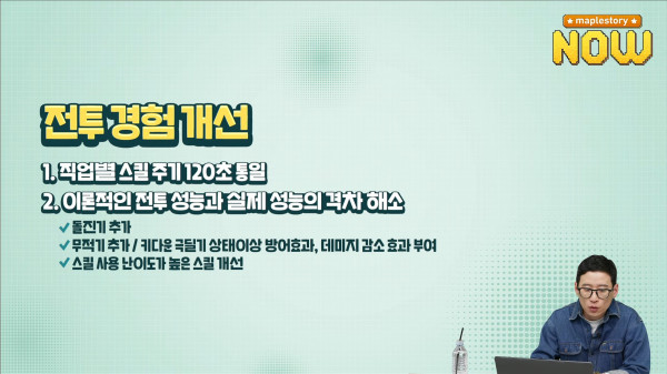 이번 업데이트의 핵심 내용은 전투 경험 개선이다. 김창섭 디렉터는 모든 직업의 스킬 주기를 120초로 통일하여 파티 구성의 자유도를 높이고, 이론적인 데미지와 실제 전투 상황에서의 격차를 줄여 전투 성능을 개선하겠다고 밝혔다.