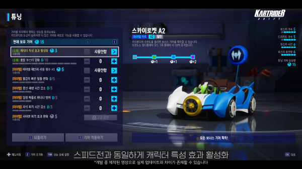 이번 영상에서는 개발 중인 내부 UI가 일부 공개되었으며, 스피드전과 유사하게 스타트 부스트, 캐릭터 특성 발동 등 전략적 선택이 가능한 시스템이 준비 중이다. 이 외에도 특정 카트바디 전용 기능도 도입되어, 단순한 외형 차이 외에 실질적인 성능 차별화를 예고했다.