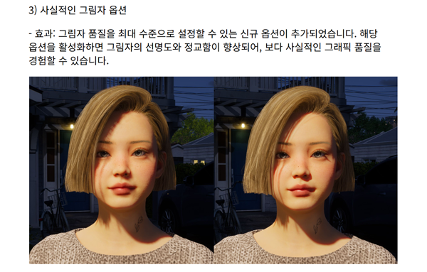 특히 그림자 부분 옵션을 추가하면서 '인조이'의 사실적인 플레이에 추가적인 조치들을 실행했다. 이제 그림자 품질을 최대 수준까지 설정할 수 있는 옵션이 신설됐고, 옵션을 실행하면 그림자의 선명도와 정교함이 향상된 것을 확인 할 수 있다.