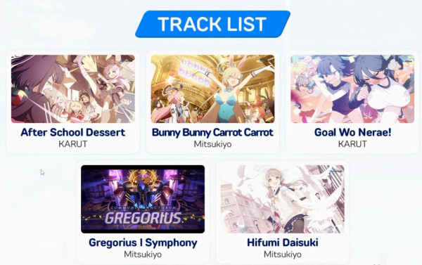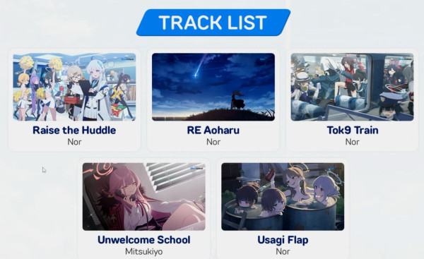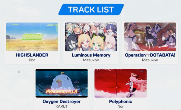 이번에 추가되는 ‘블루 아카이브’ 콜라보 DLC 팩은 15곡의 ‘블루 아카이브’ 인기곡이 추가된다. 여기에는 ‘방과후 디저트’, ‘버니버니 캐롯캐롯’, ‘골 오 네라에!’, ‘그레고리우스 심포니’, ‘히후미 다이스키’, ‘하이파이브랜더’, ‘루미너스 메모리’, ‘오퍼레이션 도타바타!’, ‘옥시전 디스트로이어’, ‘폴리포닉’, ‘레이즈 더 허들’, ‘리 아오하루’, ‘톡9 트레인’, ‘언웰컴 스쿨’, ‘우사기 플랩’ 등이 이름을 올렸다.