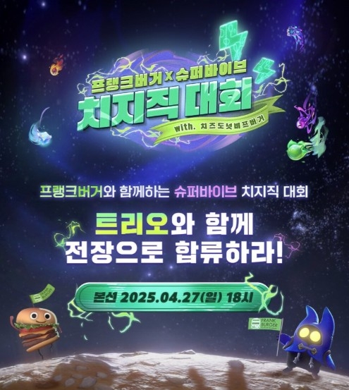 한편, 전국의 ‘프랭크버거’ 매장에는 이번 제휴를 기념하는 버거세트를 선보인다. ‘슈퍼바이브’의 인기 ‘헌터(캐릭터)’인 ‘엘루나’, ‘브랄’, ‘비보’, ‘킹핀’에서 영감을 받은 4종의 신메뉴 버거세트(치즈도넛비프버거, 어니언탑비프버거, 해쉬비프버거, 크리스피카츠버거)를 판매하며, 구매 시 각 캐릭터의 포토카드 콘셉트로 제작된 게임 재화 1,500 ‘TC코인’ 및 ‘프랭크버거 위습’ 쿠폰을 제공한다.