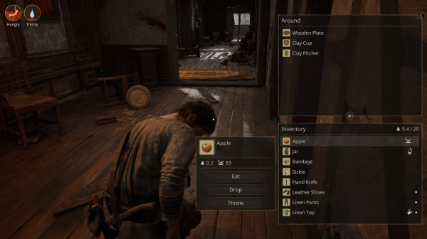 그리고 액션을 취해야 하는 물건이 있으면 그때 중앙 아이콘이 바뀌는 정도로 아주 간결하다. 메뉴 키를 누르면 여러 정보가 나온다. 메뉴를 눌렀을 때 주위에 있는 물건, 그리고 현재 자신의 인벤토리에 보유한 물건들을 확인할 수 있다. 인벤토리의 단위는 무게로서, 총량이 정해져 있는 것이 보인다. 물건의 경우 각각에 맞는 활용을 할 수 있다.