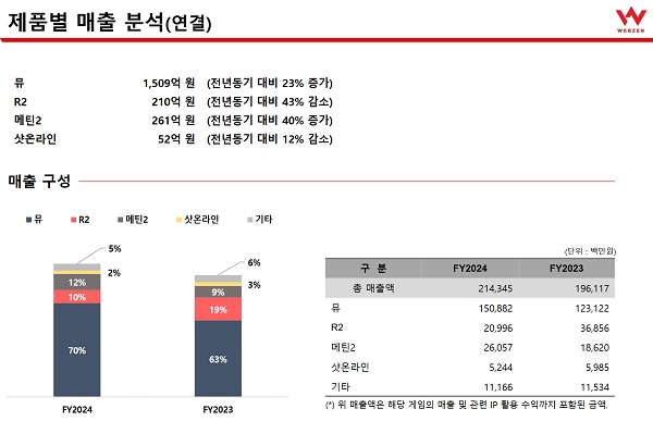 웹젠의 2024년 실적은 매출 2,147억 원, 영업이익 545억 원, 당기순이익 567억 원을 기록했다. 전년 대비 매출을 9.4%, 영업이익은 9.3% 증가했으며 당기순이익은 1.4% 감소했다.