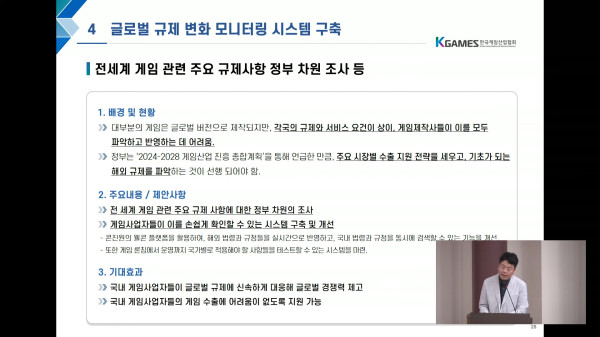 먼저 한국게임산업협회 이한범 운영위원장이 ‘2025 한국 게임산업 진흥을 위한 정책 제안서’를 발표했다. 그는 게임이 다양한 콘텐츠와 장르가 융합된 플랫폼으로서 새로운 문화를 창출하고 있으며, 국내 콘텐츠 수출의 약 63%를 차지하는 중요한 산업이라고 설명했다.