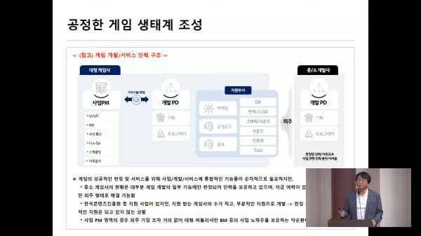 다음으로 한국모바일게임협회 김현규 수석부회장이 중소 및 인디 개발사들의 입장에서 게임 산업 진흥을 위한 정책 제안을 발표했다. 먼저 약 1,700개의 중소 및 인디 개발사가 회원사로 가입했었지만, 그중 500여 곳이 폐업했다며 플랫폼 기업의 높은 수수료 부담과 단발성 지원의 한계를 비판했다.