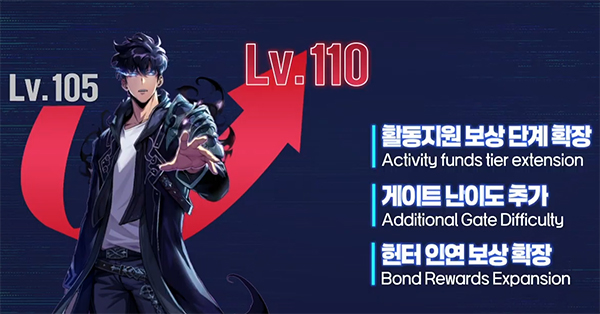 신규 스토리 오픈과 함께 성진우 최대 레벨이 105에서 110으로 상향된다. 이와 함께 활동지원 보상 단계 확장, 게이트 난이도 추가, 헌터 인연 보상도 확장된다.