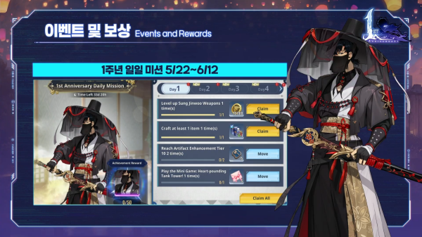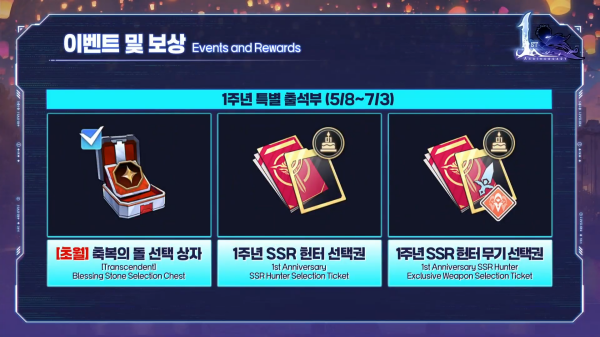 5월 8일부터 시작하는 1주년 특별 출석부를 통해 초월 등급의 축복의 돌 선택 상자, 1주년 SSR 헌터 선택권, 1주년 SSR 헌터 무기 선택권 등 역대급 보상을 제공한다.