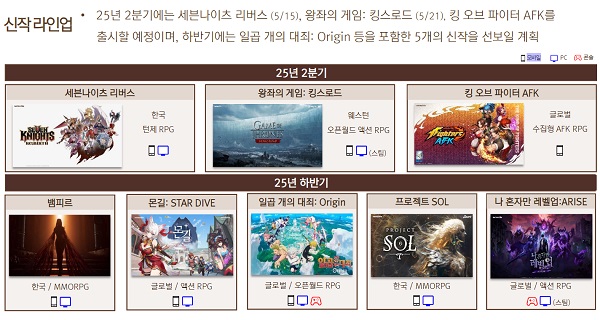 하반기에는 MMORPG ‘뱀피르’와 액션 RPG ‘몬길: 스타 다이브’, MMORPG ‘일곱 개의 대죄: 오리진’, MMORPG ‘프로젝트 SOL’ 등의 게임을 국내와 글로벌 시장에 선보일 예정이다. 또한 ‘나혼자만 레벨업:어라이즈’의 PC/콘솔 플랫폼 확장도 진행할 예정이다. 이를 통해 실적이 점진적으로 확대될 예정이다.