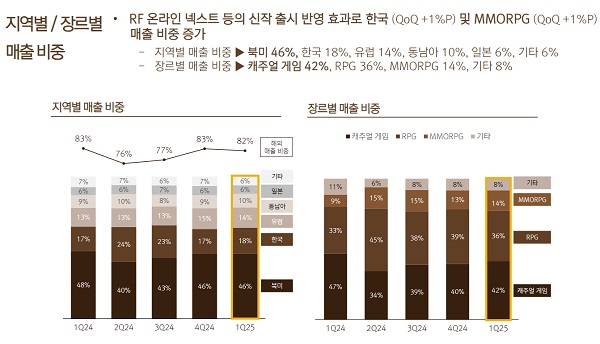 전체 매출에서 해외 매출은 5,098억 원으로 전분기 대비 5% 감소, 전년 동기 대비 5.1% 증가했으며, 매출 비중은 전분기대비 1% 감소한 82%를 차지했다. 장르별 매출 비중은 캐주얼 42%, RPG 36%, MMORPG 14%, 기타 8%로 장르 다변화 추세가 이어졌다.