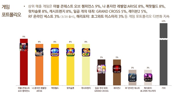 서비스 게임 중 매출은 ‘마블 콘테스트 오브 챔피언스’가 9%로 가장 높았고, ‘나혼자만 레벨업:어라이즈’와 ‘잭팟월드’, ‘랏차슬롯’, ‘캐시프렌지’가 각각 8%를 기록하며 고른 매출 분포를 보였다. 그 뒤를 ‘레이븐2’와 ‘일곱개의 대죄:그랜드크로스’가 5%를 기록했고, 3월 21일 출시한 신작 ‘RF온라인 넥스트’는 10일 가량의 매출만 반영되며 3%를 기록했다. 기타 게임 매출은 43%를 차지했다.