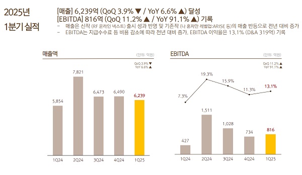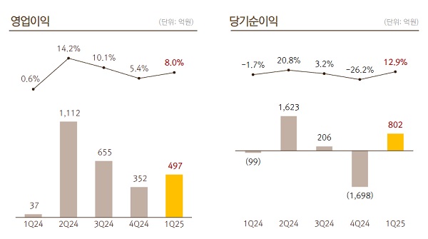 넷마블이 8일 발표한 2025년 연결기준 1분기 실적에 따르면 매출 6,239억 원, 영업이익 497억 원, 당기순이익 802억 원을 기록한 것으로 나타났다.
