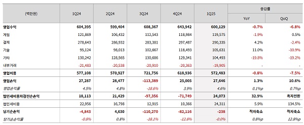 NHN의 1분기 실적이 발표됐다. NHN이 14일 발표한 2025년 연결기준 1분기 실적에 따르면 매출 6,001억 원, 영업이익 276억 원, 당기순손실 2억 원을 기록한 것으로 나타났다.