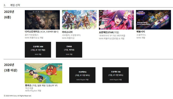 당초 2분기 출시 예정이었던 서브컬처 수집형 RPG 신작 ‘어비스디아’는 출시 일정을 2개월가량 늦춰, 오는 3분기 일본 출시를 목표로 사전예약을 진행 중이다. 또한 ‘최애의 아이’ IP를 활용한 3매치 퍼즐 신작 ‘프로젝트 스타’는 일본 유저를 타겟으로 개발 중이다. 여기에 IP 기반 퍼즐 게임 ‘프로젝트 MM’과 캐주얼 게임 ‘엠마’ 등의 게임을 연내 출시한다는 계획이다.