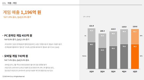 PC 온라인 게임 매출은 전분기 대비 2%, 전년동기 대비 8.8% 증가한 453억 원을 기록했다. ‘2025 한게임포커 챔피언십(HPC) 시즌1’의 성공적 개최와 ‘한게임포커 클래식’의 ‘길드전’ 고도화, 설 연휴 효과 영향으로 PC 웹보드 이용자가 전년동기 대비 21%나 증가한 것이 영향을 끼쳤다.