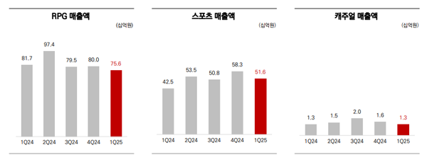 장르별 매출에서는 RPG가 756억원을 기록해 전년동기대비 7.5%, 전분기대비 5.5% 감소한 수치를 기록했다. 스포츠는 516억원의 매출을 기록했으며, 전년동기대비 21.3% 상승했지만 전분기대비 11.6% 감소했다. 캐주얼의 경우 13억원의 매출을 달성했고, 전년동기 대비 0.9%, 전분기대비 21% 상승했다.