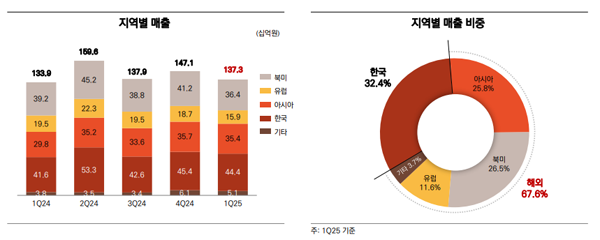 지역별 매출에서는 한국이 2025년 1분기 444억원으로 전체의 32.4%를 차지해 비중이 가장 컸다. 아시아 지역은 354억원으로 25.8%의 비중을, 북미 지역은 364억원으로 26.5%의 비중을 보여줬다. 전체 매출의 해외 매출은 총 928억원으로, 전년동기대비 0.6% 상승했으나 전분기대비 8.7% 감소했다.