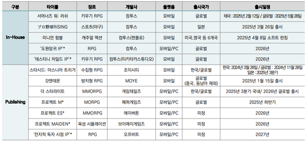 2026년 게임 라인업도 준비되어 있다. 자체 개발작인 '도원암귀' IP 게임과 '데스티니 차일드' IP 게임이 준비되어 있으며, 에이버튼의 '프로젝트 ES', 오프비트의 '전지적 독자 시점' IP 게임 등도 등장한다.