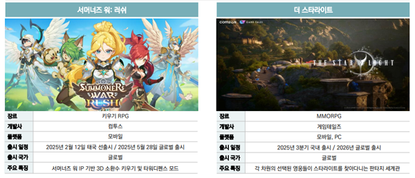 신작 출시 역시 이어진다. 자체 개발작과 퍼블리싱 게임 신작들이 지속적으로 등장하며, 지난 1월 '갓앤데몬' 출시를 시작으로 오는 5월 28일에는 '서머너즈 워: 러시'의 글로벌 출시가 이어진다. 하반기에도 게임테일즈의 '더 스타라이트', 페퍼게임즈의 '프로젝트M'이 출시되어 RPG 라인업을 강화할 예정이다.