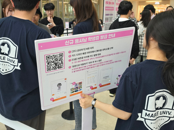 먼저 메이플 대학교 학생증 발급 코너다. 현장을 찾은 방문객은 ‘메이플핸즈+’ 앱과 연동해 자신의 캐릭터 정보를 불러오거나 ‘AI 스타일 파인더(AI Style Finder)’ 서비스를 이용해, 즉석에서 자신이 원하는 외형의 캐릭터를 제작할 수 있다. 그리고 이 캐릭터가 담긴 학생증 포토카드 제작이 가능했다.