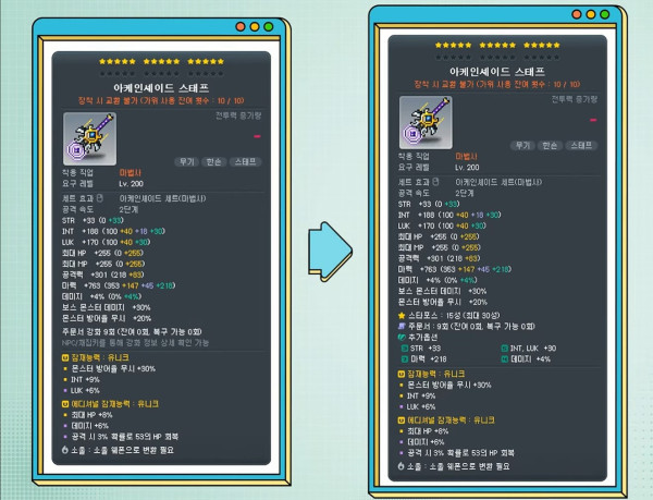 특히 툴팁의 정보 표시 방식과 폰트 색상, 정렬 등이 조정돼 가독성이 높아졌고, 추가 옵션의 합산 등급 표시는 삭제되어 혼란을 줄였다. 강화 UI는 창 크기와 인벤토리 연동성이 강화됐고, 환생의 불꽃 등 반복 사용 아이템의 연속 사용 기능이 추가됐다. 메소 마켓의 시세 갱신 주기도 단축되어 실시간 시장 반영이 빨라졌다.