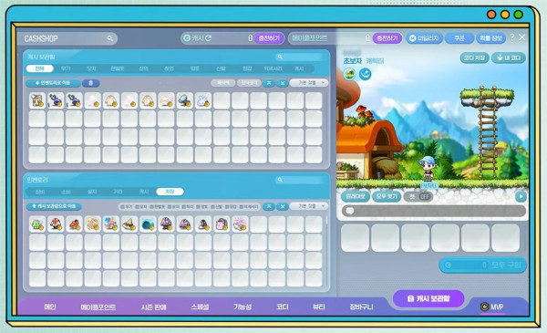 캐시샵은 오랜만에 전면 개편됐다. 해상도가 16:9로 변경되고, 레이아웃과 카테고리 구조가 직관적으로 바뀌었다. 파워 엘릭서 패키지 등 일부 상품은 구매 즉시 메이플 포인트로 전환되는 기능이 도입됐고, 보관함과 코디 영역에서도 대량 이동·삭제 등 편의 기능이 추가됐다. 헤어·성형 쿠폰도 개별 아이템 단위로 구매할 수 있게 됐다.