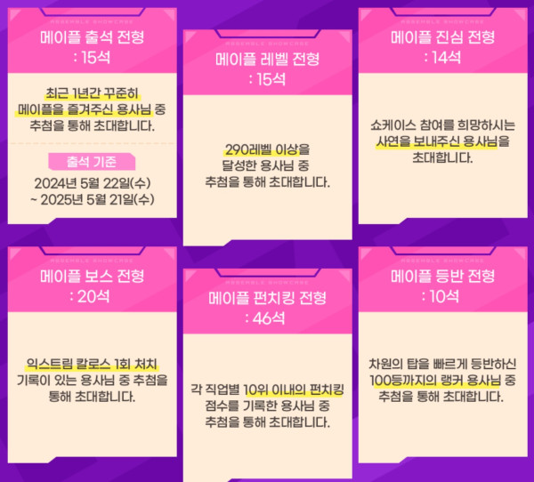 특히 올해는 ‘추억’, ‘레벨’, ‘진심’, ‘보스’, ‘펀치킹’, ‘등반’ 등 다양한 전형을 통해 열정적인 유저를 초청하는 특별 이벤트도 마련됐다. 각 전형별로 꾸준한 접속, 고레벨 달성, 사연 응모, 익스트림 칼로스 클리어, 펀치킹 상위 랭커, 차원의 탑 100위 등 다양한 기준이 적용된다.