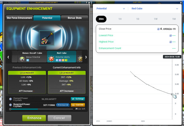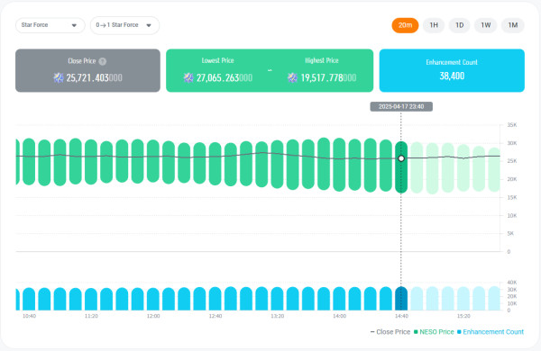 현재 시스템은 ‘가격 탐색 단계’에서 ‘가격 변화 단계’로 전환되는 과도기에 있다. 초기에는 데이터가 충분하지 않아 가격이 크게 출렁였지만, 시간이 지나며 유저들의 강화 시도 데이터가 누적되면서 점차 안정화되고 있다.