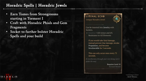 이와 함께 속성 공격의 변화와 엘리트 몬스터의 특수 옵션을 무력화할 수 있는 요소들도 있어 조합에 따라 유저 성향에 맞춰 자유롭게 빌드 구축을 이어갈 수 있는 것이 새시즌의 핵심 플레이로 소개됐다. 호라드릭 보석은 관련된 스킬들을 더욱 확장하고 강력하게 만들 수 있는 부가 요소로 등장한다.