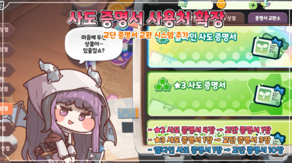교환 비율은 2성 증명서 4장당 교단 증명서 1장, 3성 증명서 1장당 교단 증명서 3장, 엘다인 사도 증명서 1장당 교단 증명서 10장으로 책정됐다. 이로써 효율적인 자원 관리와 육성의 동기 부여가 동시에 이뤄질 것으로 보인다. 세부적인 시스템 안내는 별도 공지로 제공될 예정이다.