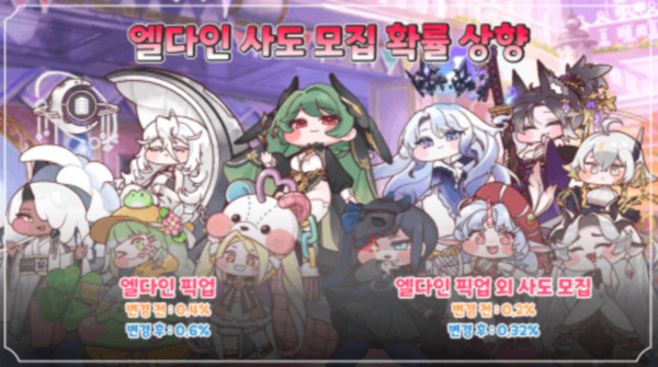 핵심 캐릭터인 엘다인 사도의 등장 확률도 상향 조정된다. 엘다인 사도는 엘리아스 세계관에서 중요한 역할을 담당하지만, 기존 시스템에서는 낮은 등장 확률로 인해 많은 유저들이 접근하기 어려웠다. 이에 따라 엘다인 사도가 픽업 사도로 등장할 경우 출현 확률이 기존 0.4%에서 0.6%로, 3성 사도 픽업·선택·성격·일반 모집에서는 0.2%에서 0.32%로 각각 상향된다.