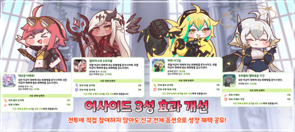 어사이드 3성 달성 시의 효과도 한층 강화된다. 기존에는 해당 사도가 전투에 직접 참여해야만 효과를 볼 수 있었으나, 앞으로는 어사이드 3성만 달성하면 주력 덱에 포함되지 않은 사도도 신규 전체 옵션의 혜택을 공유할 수 있게 된다.
