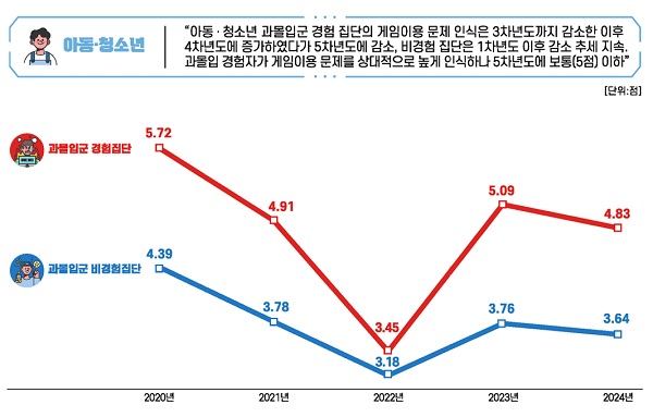 아동·청소년, 학부모, 성인 모두 게임이용에 대한 문제 인식이 5년간 꾸준히 감소했다. 아동·청소년의 자기 인식 점수는 1차년도 4.47점에서 5차년도 3.71점으로 낮아졌고, 학부모의 경우 자녀의 게임이용에 문제가 있다고 응답한 비율이 34.5%에서 19.5%로 15%p 감소했다. 학부모가 우려하는 주요 문제(학습능력 저하, 심리·정서 불안)도 1차년도 대비 크게 줄었다. 문제행동에 대한 조치 역시 대부분 가족 내 상담에 그쳤고, 전문상담이나 병원 방문 등 외부 개입은 5% 미만이었다.