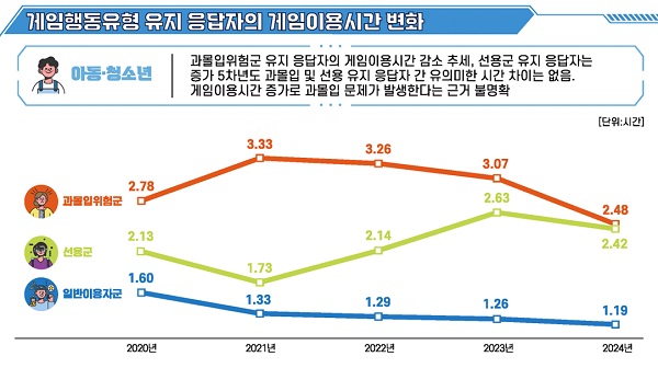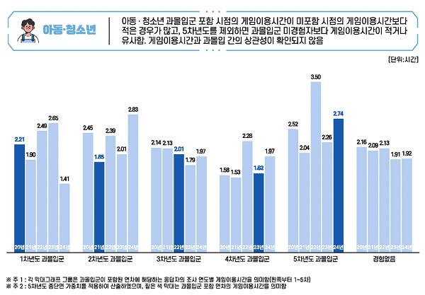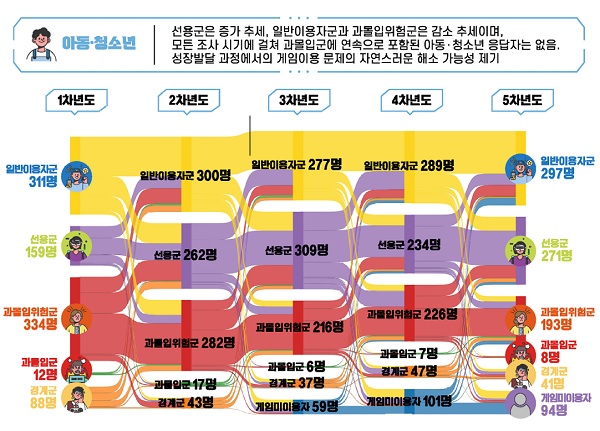 5년간 조사에서 아동·청소년의 게임행동유형은 대조집단(비과몰입군)과 선용군(게임의 긍정적 효과를 경험하는 집단)이 증가하고, 과몰입위험군·경계군·과몰입군은 감소하는 추세였다. 1차년도 159명이던 선용군은 5차년도 271명으로 늘었고, 334명이던 과몰입위험군은 193명으로, 88명이던 경계군은 41명으로 줄었다. 게임을 전혀 이용하지 않는 미이용자도 5차년도에 10.4%로 나타났다.